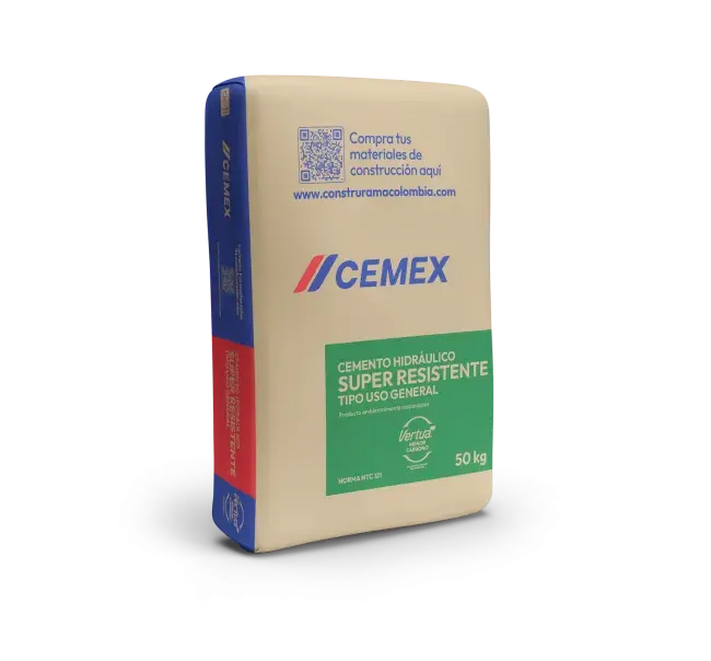 El cemento Super Resistente es un cemento Vertua Menor Carbono que desarrolla altas resistencias iniciales y finales, provee una excelente durabilidad en ambientes con polución y tiene un buen desempeño en el terminado. Es un cemento con menores emisiones de CO2 directas netas en comparación con la emisión directa neta de un cemento tradicional tipo I*. Cuenta con un excelente desempeño, mayor desarrollo de resistencia que permite desmoldar o descimbrar en menor tiempo que otros cementos. *Referencia: emisión neta promedio global sectorial por tonelada de clinker (fuente: Getting The Numbers Right – año 2000 - https://gccassociation.org/gnr/) y el factor de clinker típico de un cemento Tipo I (equivalente a cemento ASTM C 150, Tipo I).