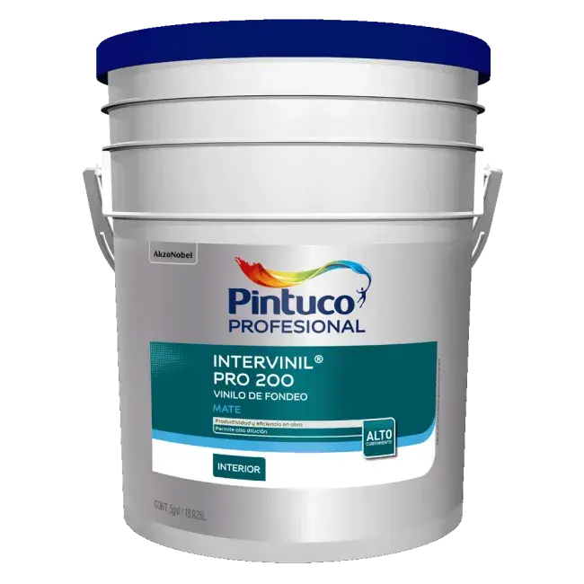 Intervinil ® PRO 200 es una pintura Tipo 2 base agua, fabricada a partir de copolímeros acrílicos, de acabado mate, diseñada para brindar mayor productividad y economía en primeras manos, ya que permite altas diluciones conservando buen cubrimiento. Recomendada para primeras manos sobre muros o acabado en cielo rasos de edificaciones en general, en ambientes interiores tanto en obra nueva como en repintes. Para uso sobre superficies previamente pintadas o nuevas como mortero, ladrillo, fibrocemento, madera, estuco y yeso.
