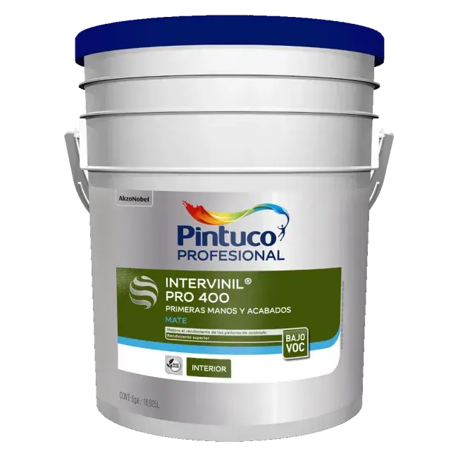 Intervinil® Pro 400 es una pintura Tipo 2 base agua, de alta blancura, fabricada a partir de copolímeros acrílicos, de acabado mate, diseñada para proporcionar buen cubrimiento y rendimiento aún en altas diluciones. Posee un acabado muy terso y suave, su nivelación es excelente y cuenta con un bajo contenido de Compuestos Orgánicos Volátiles VOC (<40 g/l). Recomendada para primeras manos o acabado en cielos rasos y en zonas de bajo tráfico de edificaciones en general, en ambientes interiores tanto en obra nueva como en repintes. Para uso sobre superficies previamente pintadas o nuevas como mortero, ladrillo, fibrocemento, madera, estuco, concreto y yeso.