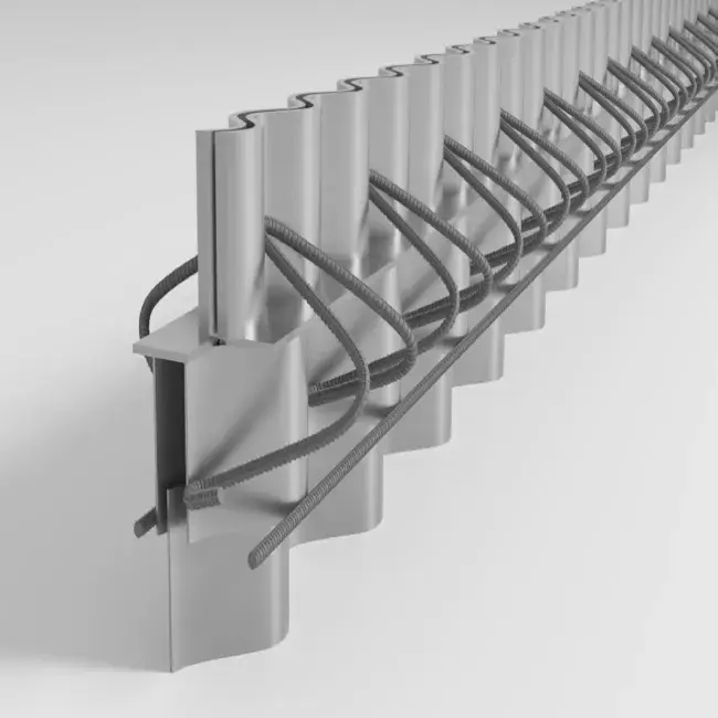 La junta Cosinus Slide® Es un sistema de transferencia de carga continua, en combinación con un revolucionario sistema de anclaje 3D, refuerza la transferencia de carga sobre y a lo largo de toda la junta. La capacidad de transferencia de carga es lo más importante en las soluciones de juntas y en los suelos industriales.
